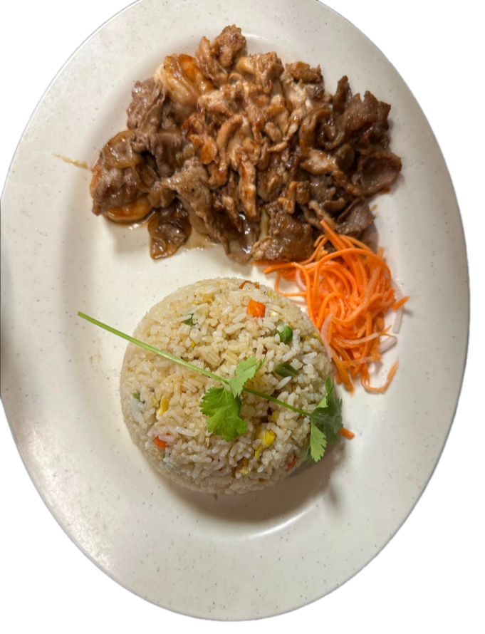 Your choice of meat served with fried rice, and carrot